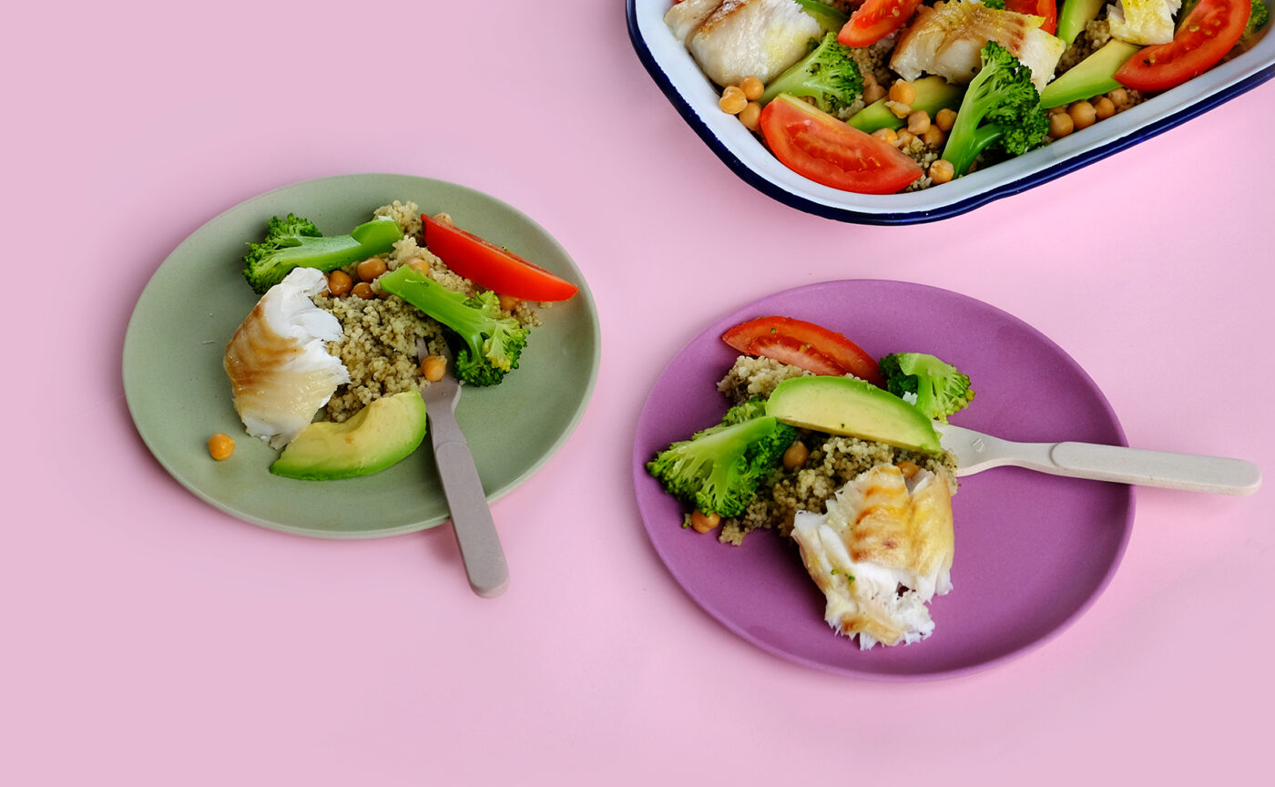 Mix the pesto through the couscous and add the chickpeas. Mash the chickpeas for babies and younger children. Add the broccoli, chopped avocado and chopped tomato. Top with the roasted cod and enjoy.