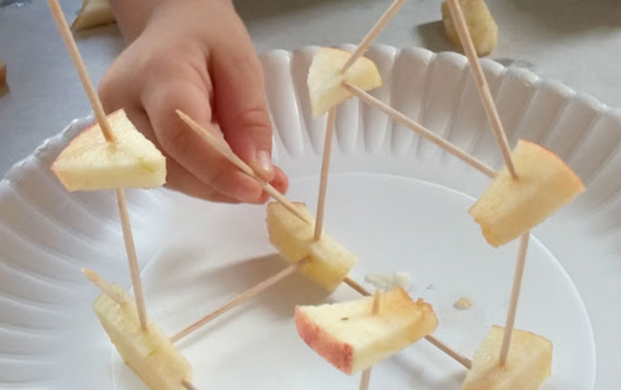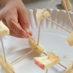 Cut the apple into different cubes and start connecting them to the toothpicks with your child, being mindful of the sharp endings of the toothpicks.