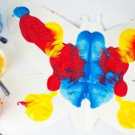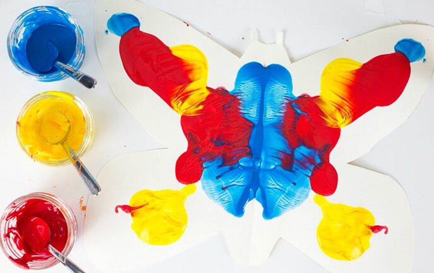 Then, fold the paper over, pressing down lightly. Unfold and reveal a beautiful butterfly. Discuss with your child how the paint they put on one side is now the same on both. This is called symmetry, meaning the same on both sides.