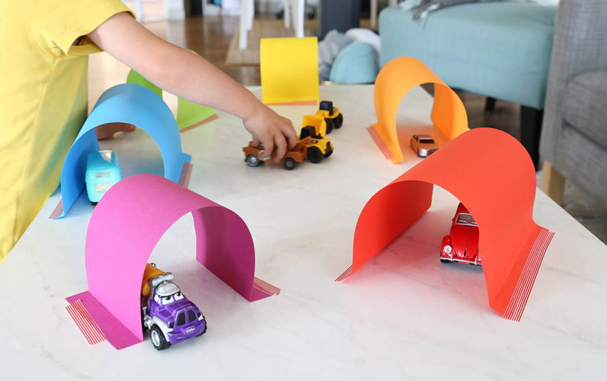 Give your child some toy cars and have fun playing together, as you model how to push the cars through the tunnels.