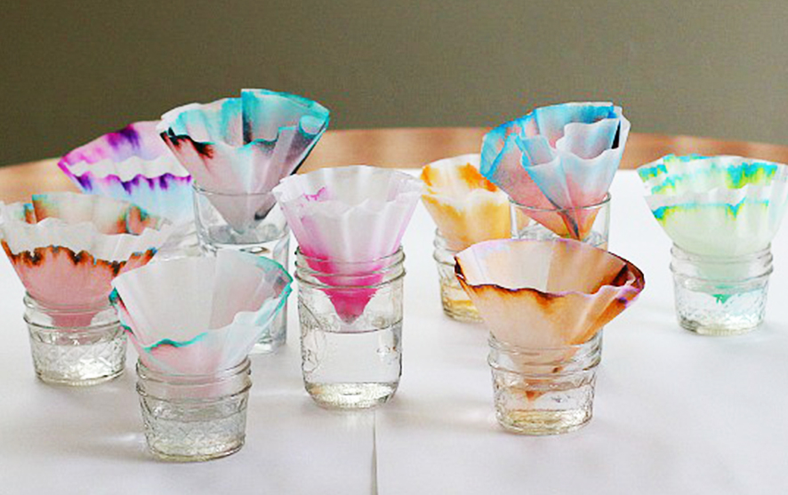 Using the pencil, draw a line 1cm from the bottom of the coffee filter paper. Then, using the marker, draw a short line over the pencil mark. Pour a little water into the glass (enough to cover the bottom), place the paper bottom down into the glass ensuring the pencil line is above the water level. The water will travel up the paper and begin to separate the solvent revealing a mix of colours, remove the paper from the glass and discuss the different colours you can see which have separated from the black ink.
