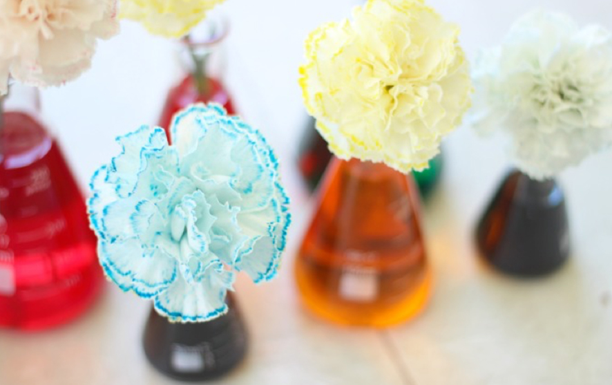 Put about 10-15 drops of food colouring into the water and stir around a bit. Add a white carnation into each pot and watch over time how they change colour!
