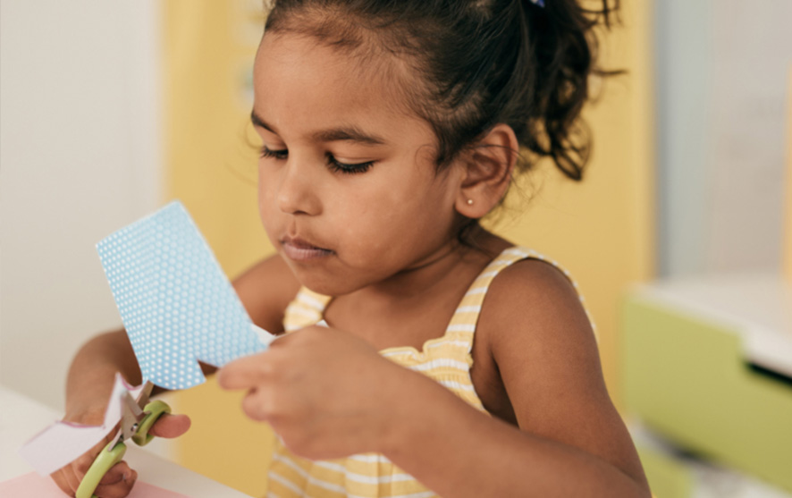 Depending on your child’s level of development and ability to use scissors, you may like to start with a more simple cutting pattern such as straight lines, before progressing to zig-zag and wavy lines, shapes such as circles etc.