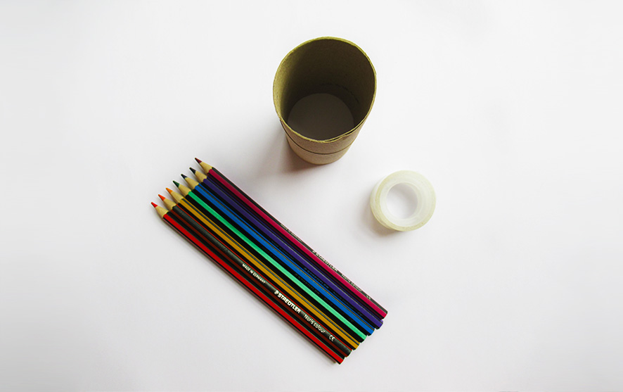 Prepare your tool ahead of time. You will need an empty cardboard tube and a selection of crayons or markers. Tape your crayons/markers around the outside of the tube. Ensure there is some tube above the top of the pens to hold on to and that they are securely stuck (masking tape is ideal).