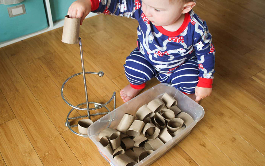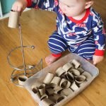You will need several cardboard tubes to be cut into pieces, providing different sized stacking rings. The older your child, the more able they will be to pick up thinner, smaller objects, so you can use their age and developmental level to help determine how thick or thin to cut your rings.