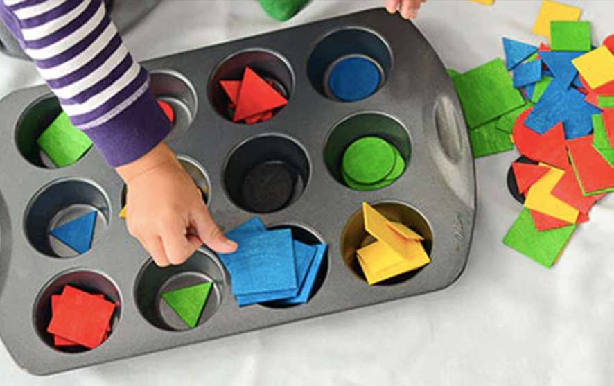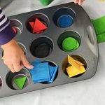 Set out the muffin tin and series of objects. Encourage your child to place (or attempt to place) the objects into the holes of the tin, to see if they fit. You may need to model this to encourage them to have a go.