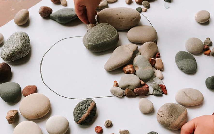 Set up the pebbles or other natural objects to be explored. Demonstrate to your child how they can place these along the outlines of the shape, or within it, creating a puzzle like activity, where you work to find pieces that will fit together and cover all of the shape.
