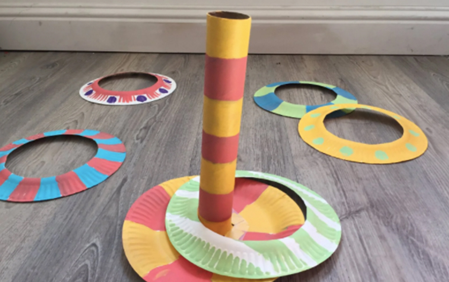 Throw your rings toward the stick to play the ring toss game. Older children will enjoy the added challenge of keeping score, and may like to do so on a piece of paper, marking down each point earned by each player.