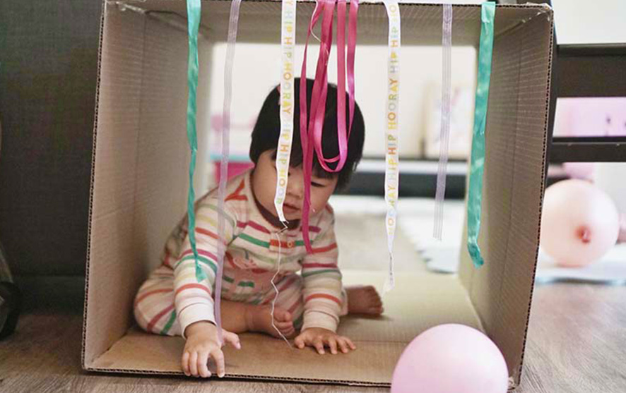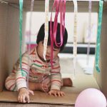 The cardboard box will act as a tunnel for your child to crawl through. Using various materials listed, cut them and stick them to the edge of the box so that they will drape down. As your child finds their way to the end or opening, they are met with different textures and colours to see, feel and manoeuvre through.