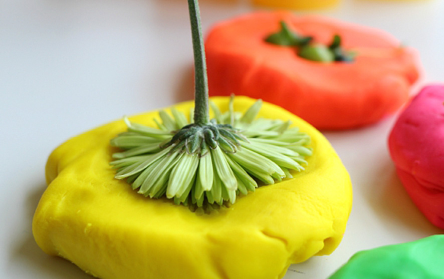 Set up an area such as a table or even high chair tray. Provide your child with the playdough and the objects and let them explore.