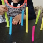 This finger gym experience will really support your child’s fine motor skills, encouraging use of their fingers to grab objects rather than just a whole handed grasp that is first used by babies, before their fingers strengthen. Having to pull out the straws and push them into the holes will also improve hand-eye coordination and problem-solving abilities.