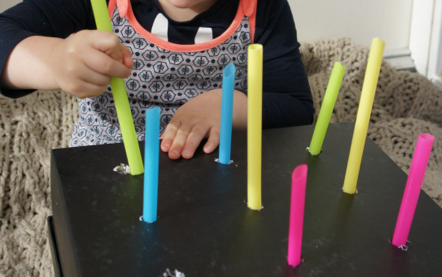 Let your child explore for themself for a little while and see if they can work out that they can pull the straws out. After observing and watching what they do, you may like to model to your child how they can pull the straw out/poke it back into the hole.