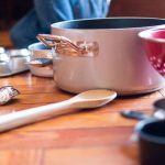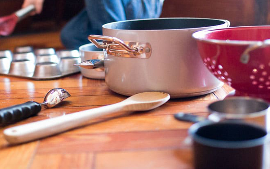 Set out a large area (on a rug or soft floor) and lay out the materials (some suggestive, for example placing spoons and beads in a metal bowl to encourage your child to make sounds with the materials) and let your child explore; banging, tapping, mouthing and feeling objects, looking at their reflection and uses their senses!