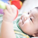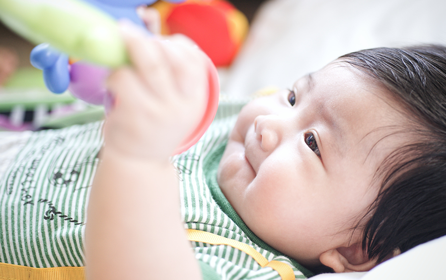 This activity will help your child become aware of their own body through touch and movement, explore interesting toys around them and follow moving objects.