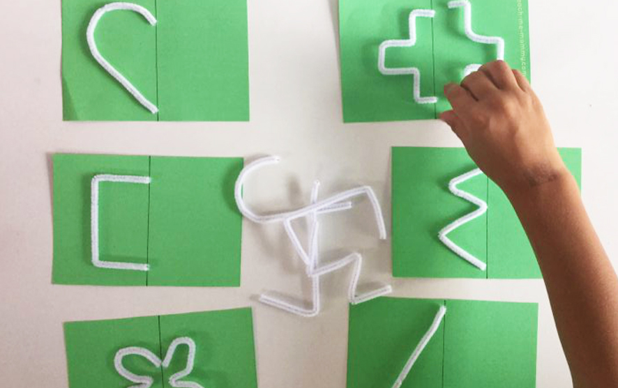 Create half a shape on a piece of card using the pipe cleaners or alternative resources, create various shapes such as triangles, rectangles, etc. depending on your child’s understanding of shapes. Do this multiple times using various shapes.