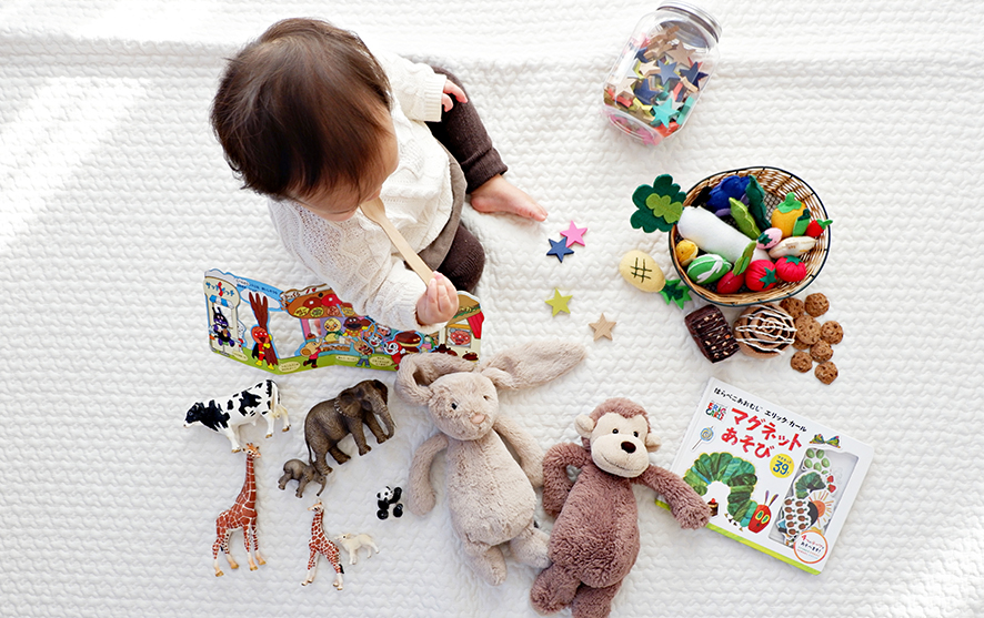 Cover the tray with the blanket/piece of fabric and quickly remove one from underneath, placing it behind your back. Take off the fabric and see if your child notices that an item is missing – even young babies can subitise up to around three objects, so will likely be able to see something is missing.